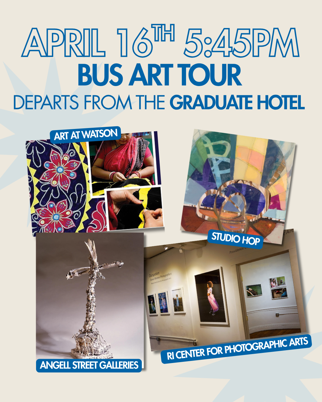 Join us for April’s Gallery Night! Tours depart from the Graduate Hotel at various times throughout the evening and return approximately two hours later. Please note which tour you are registering for, as departure times vary. These are walking and bus tours, so wear comfortable shoes and dress for the weather!